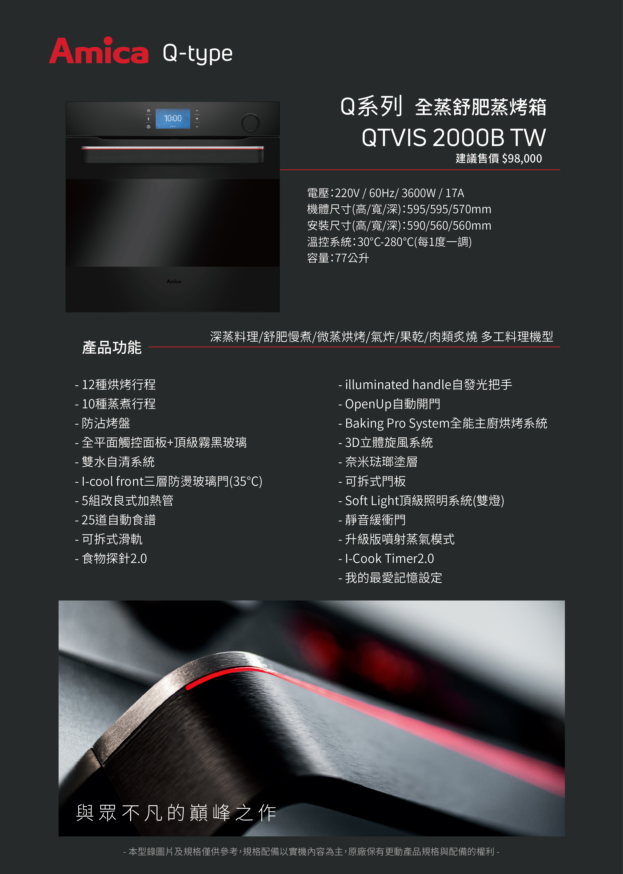 配件:易潔深烤盤、易潔淺烤盤、烘烤網架、帶孔蒸盤、實心蒸盤、食物探針2.0